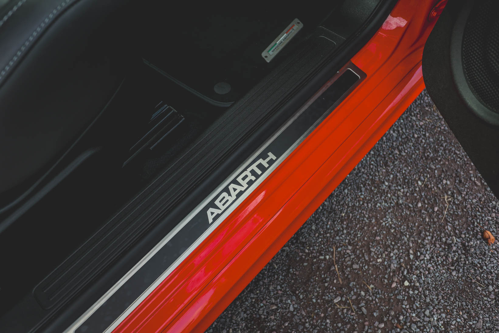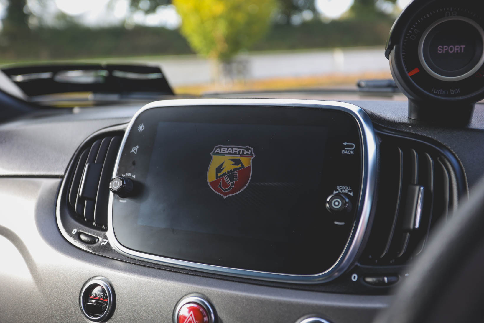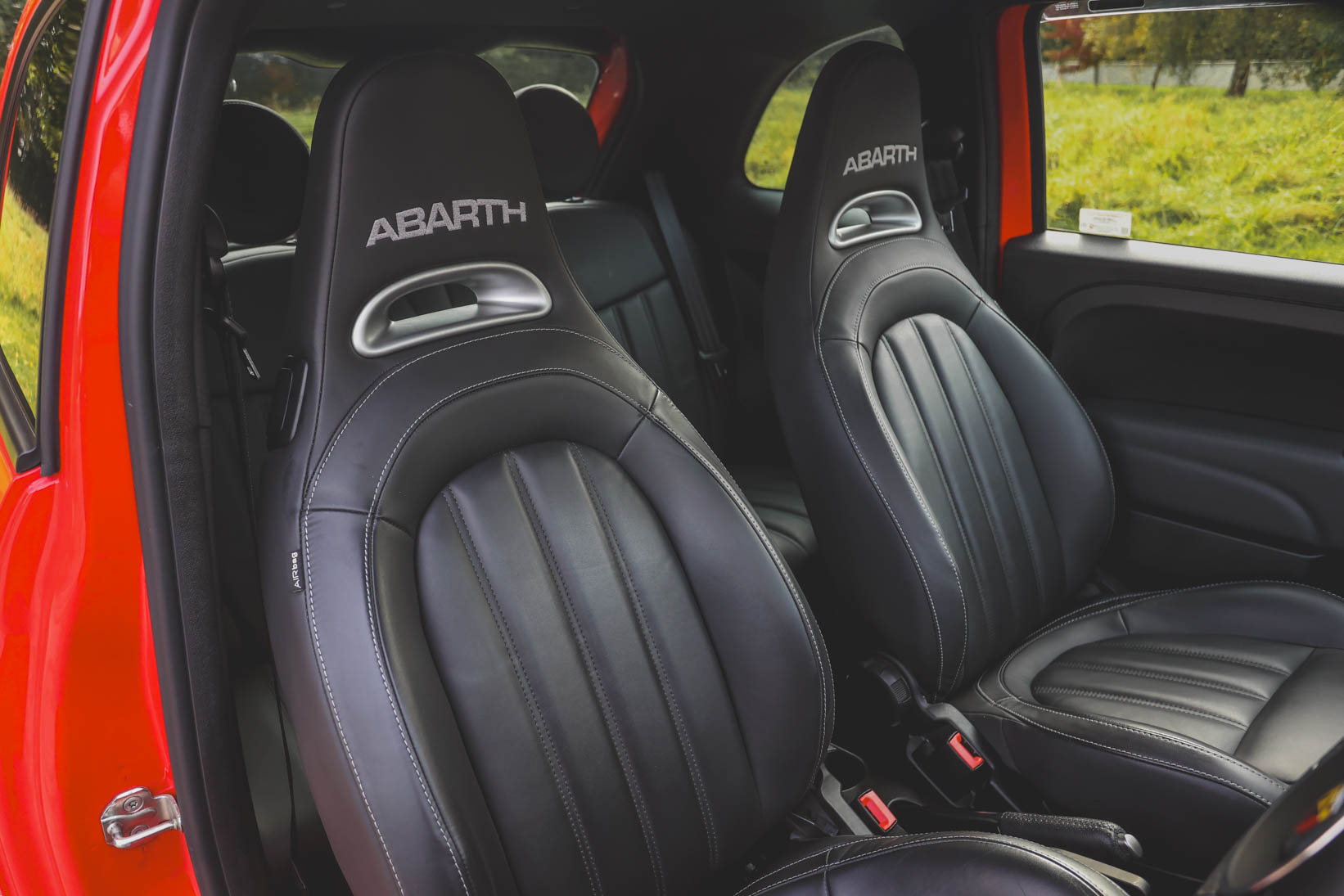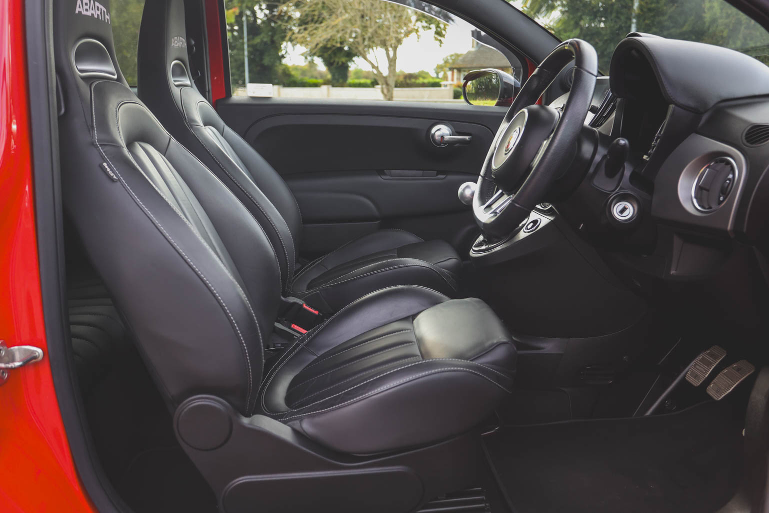 The Abarth branded black leather seats with white piping, alloy pedals and Turbo boost gauge add to the drama, too.