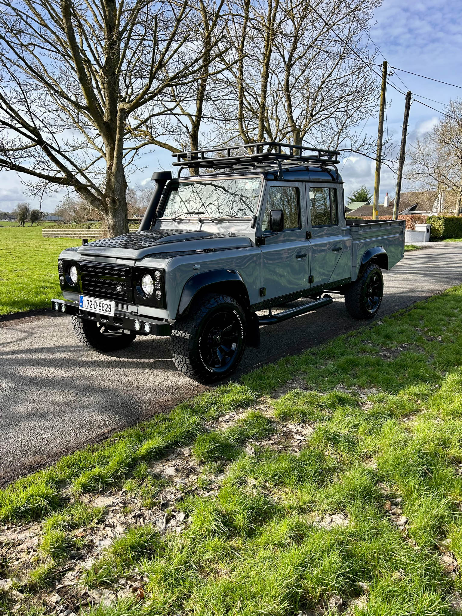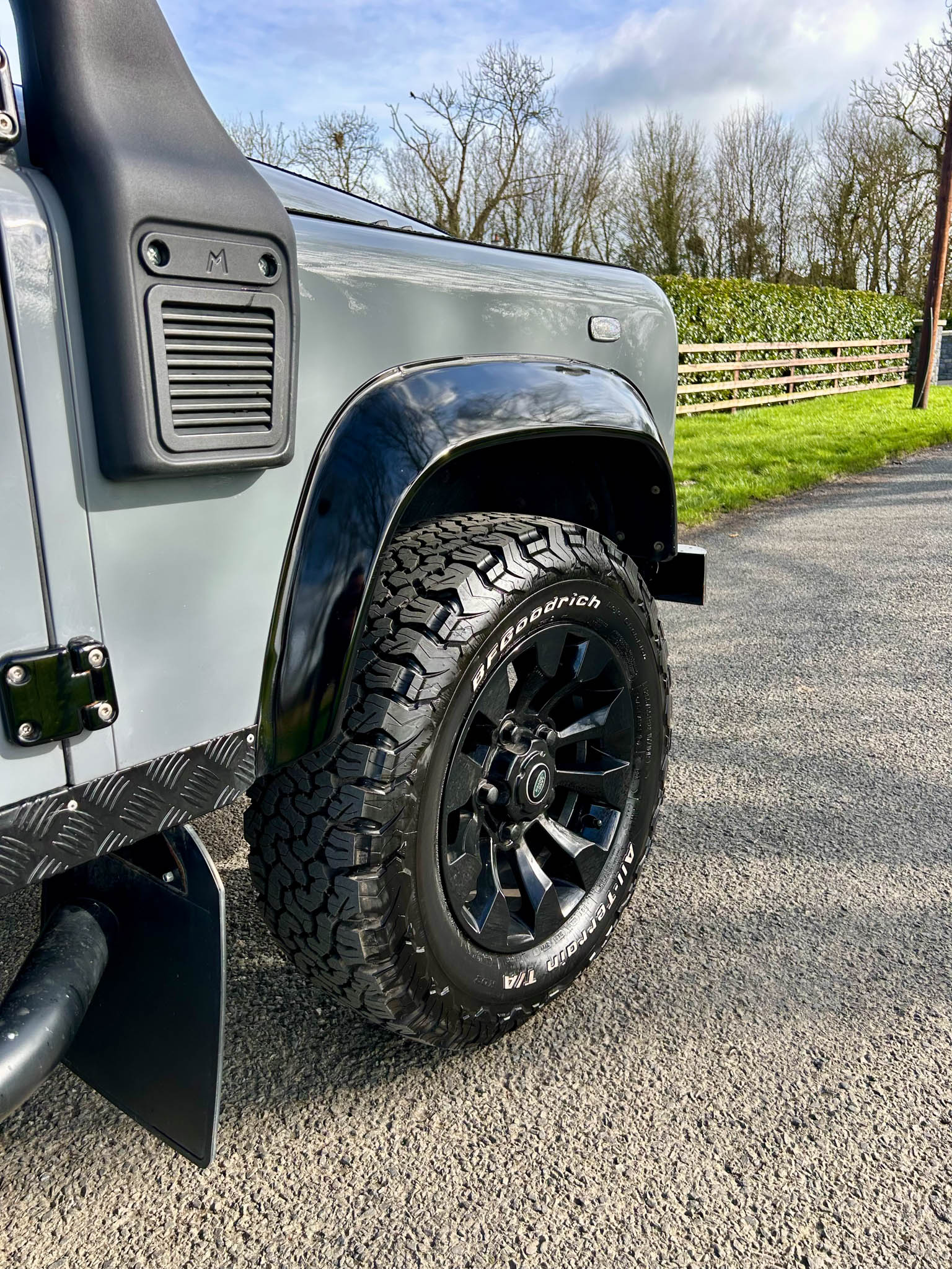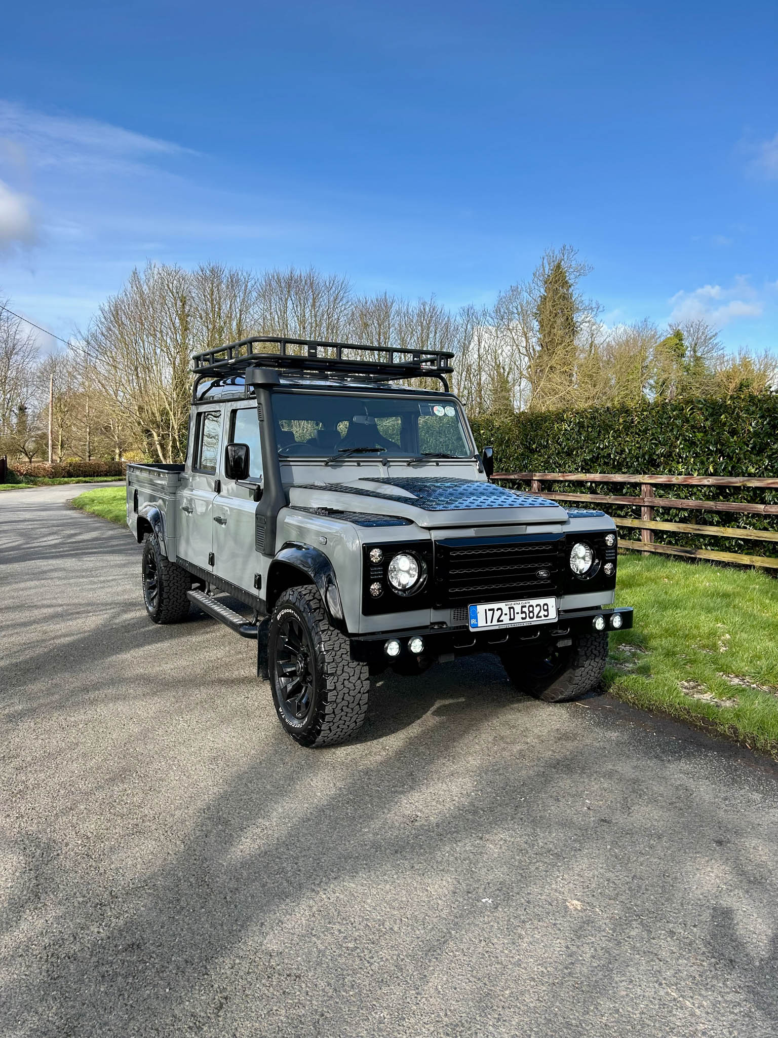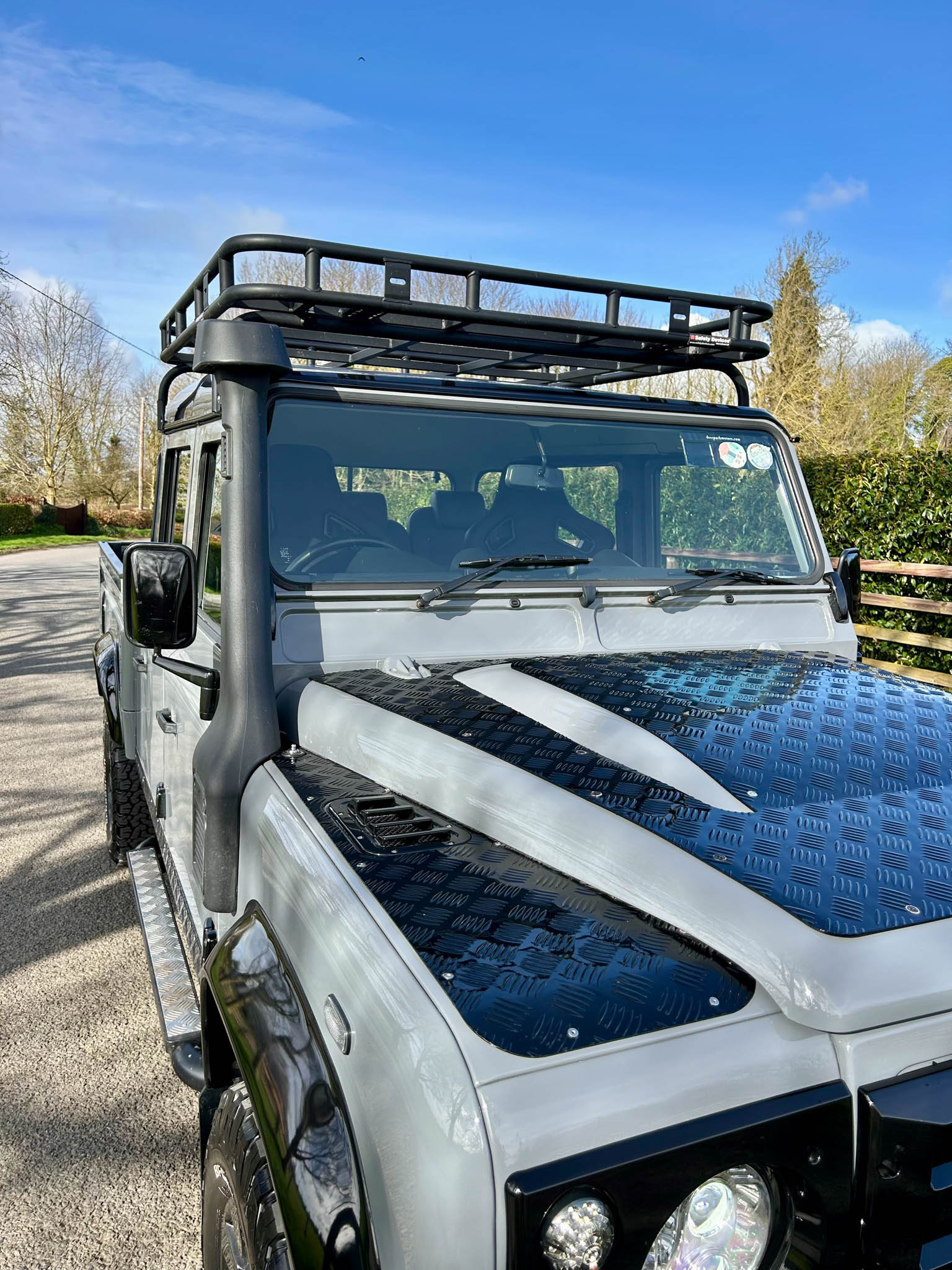Visually, it has all the right upgrades that elevate it from a standard Defender into something far more special. Sitting proudly on upgraded wheels that perfectly fill the arches, the stance is exactly what you want from a 130. Up front it’s been fitted with the classic Defender grille and bonnet protection grates that give it that unmistakable expedition-ready look, while the snorkel completes the proper off-road aesthetic and hints at the capability that lies beneath.